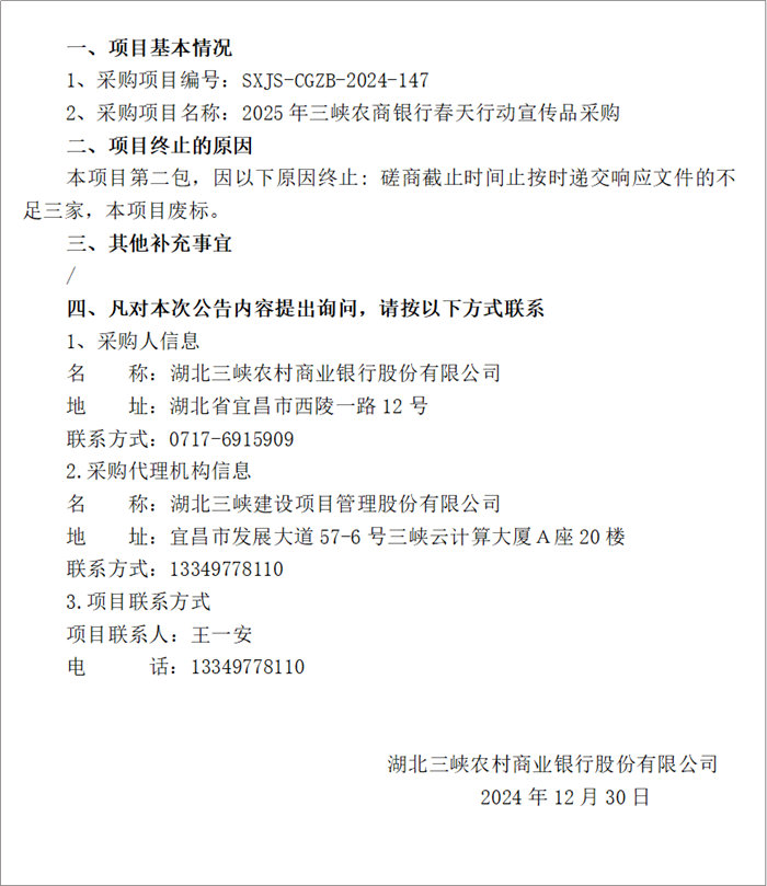 | 2025年三峽農(nóng)商銀行春天行動(dòng)宣傳品采購(gòu)(包二) 廢標(biāo)公告 |